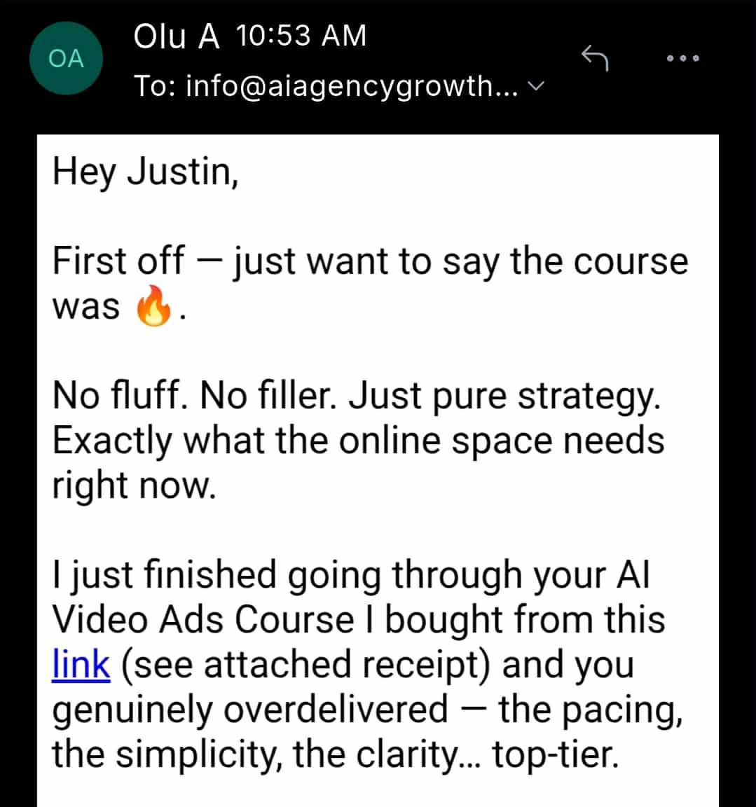 “Hey Justin, First off — just want to say the course was 🔥. No fluff. No filler. Just pure strategy. Exactly what the online space needs right now. I just finished going through your AI Video Ads Course I bought from this link (see attached receipt) and you genuinely overdelivered — the pacing, the simplicity, the clarity… top-tier.” –Olu A.