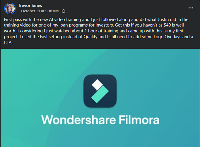 “First pass with the new AI video training and I just followed along and did what Justin did in the training video for one of my loan programs for investors. Get this if you haven't as $49 is well worth it considering I just watched about 1 hour of training and came up with this as my first project.” -Trevor S.