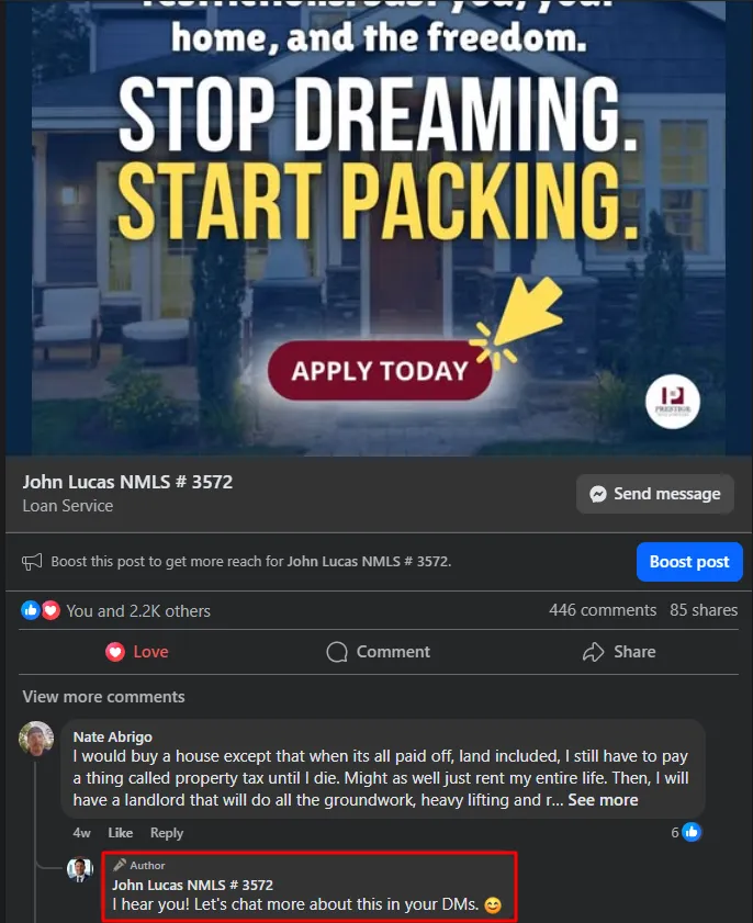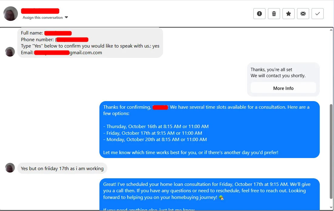 The AI sends a Messenger DM to pre-qualify and book the lead.